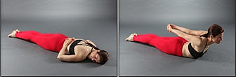 Exercise: Inhale, lift the chest off the floor and extend the arms up and back; hold this position for one breath, then turn the right ear to the mat, bend the elbows and rest the chest to the floor; repeat 10x, alternating the resting head position with each rep.